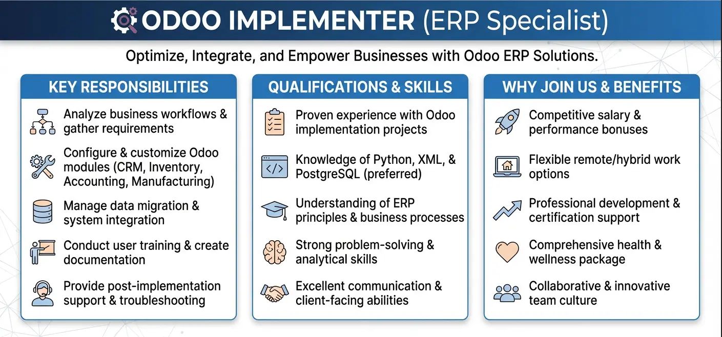 - Familiarity with Odoo.sh or community/enterprise versions.